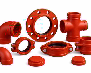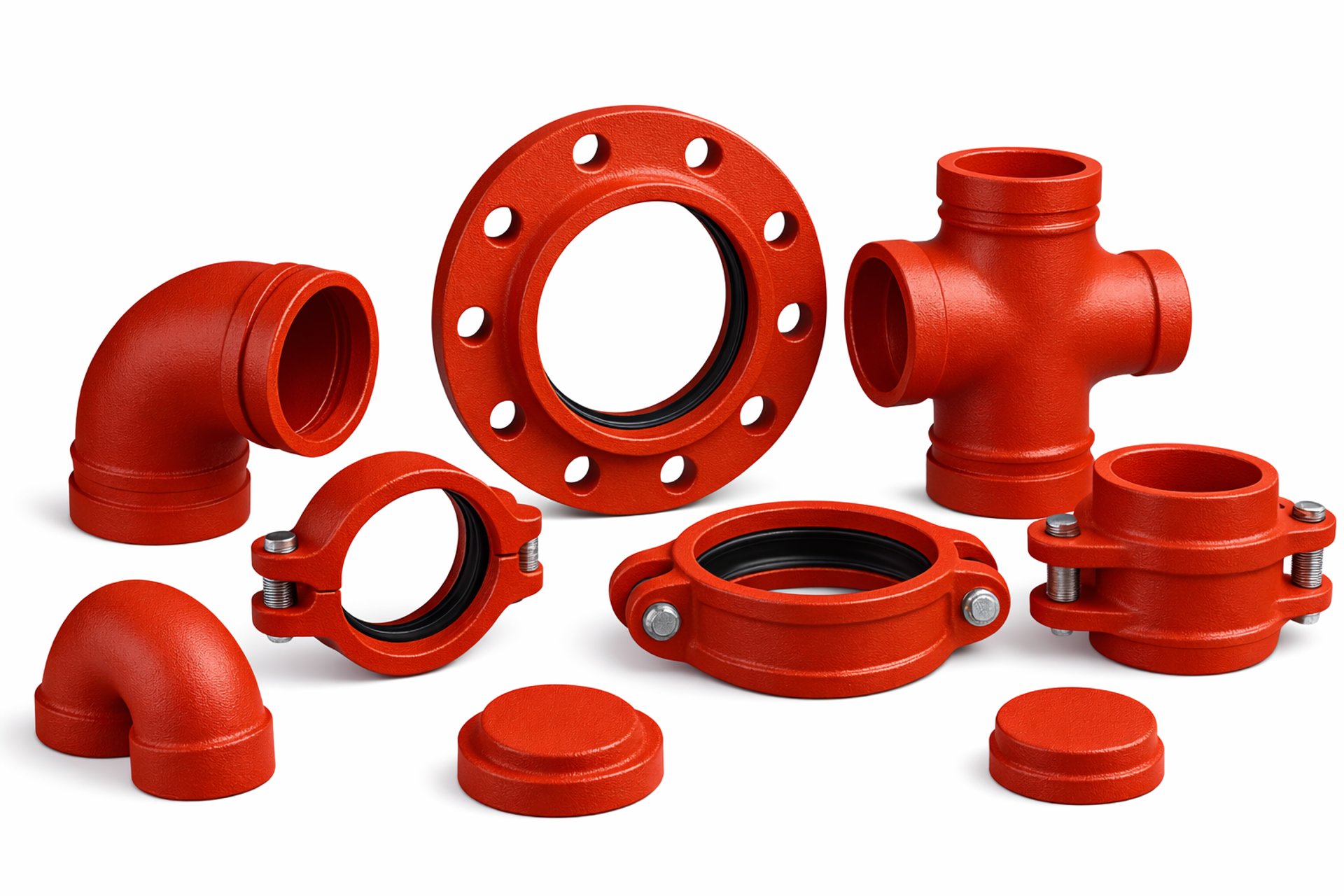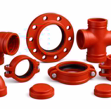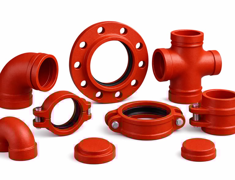 Fabricadas em ferro fundido ou aço, garantem estanqueidade e absorção de vibrações. Disponíveis em diversos modelos — como curvas, tees, cruzetas, flanges, uniões, tampões e acoplamentos — as conexões grooved oferecem versatilidade para atender projetos de diferentes portes e exigências técnicas.